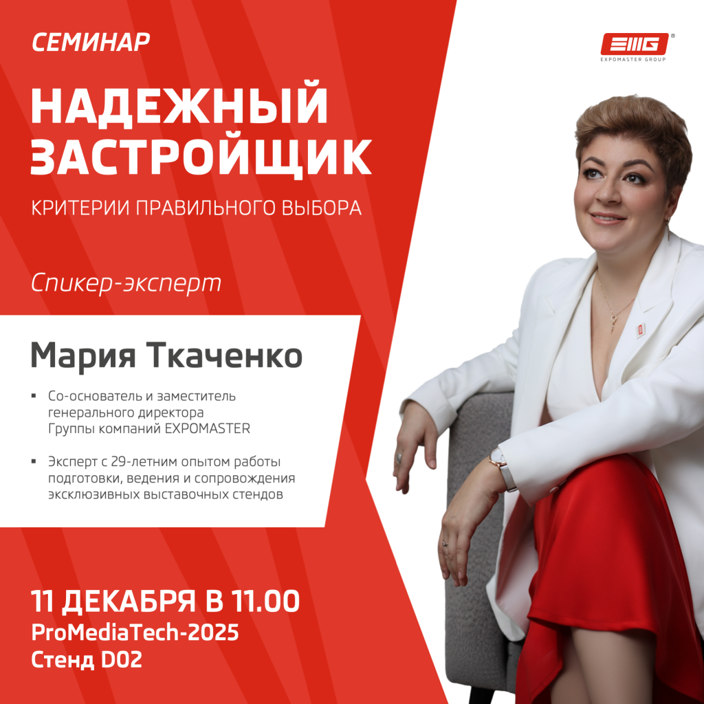 11 декабря в 11:00 на стенде D02 EXPOMASTER – BESTLY спикер-эксперт Мария Ткаченко проведет семинар «Надёжный застройщик. Критерии правильного выбора»